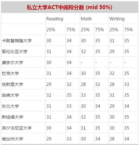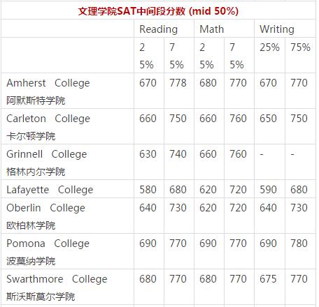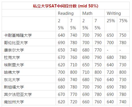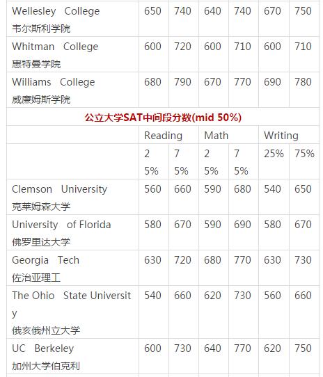 下面几个表格是各类型大学录取学生的老SAT/ACT中间段成绩,每一个单项也详细列出来了。一般来说,中国学生的SAT数学会高于平均分,但SAT阅读达650分以上的不多。