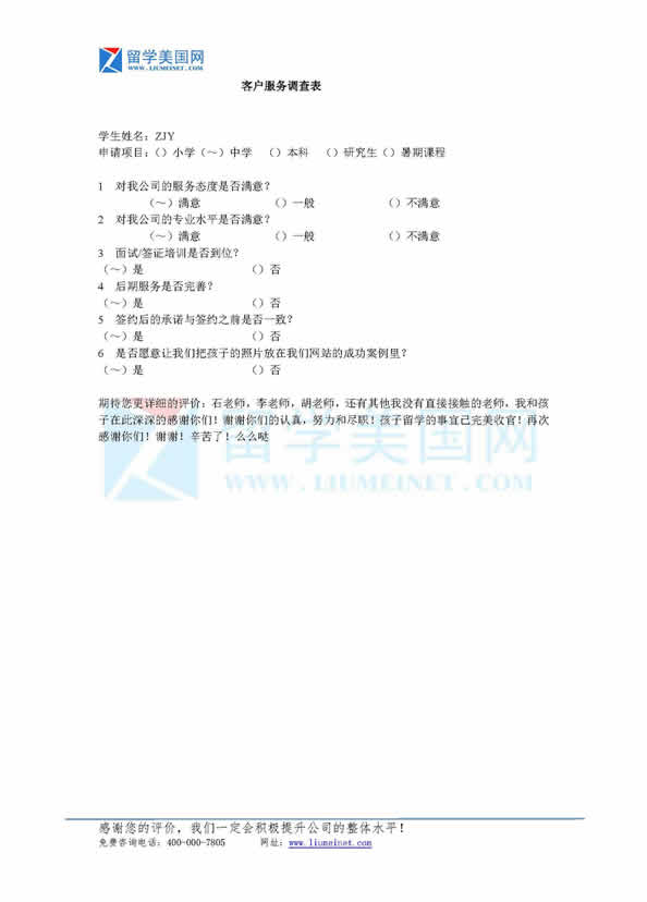 下面是学生家长反馈调查表,
