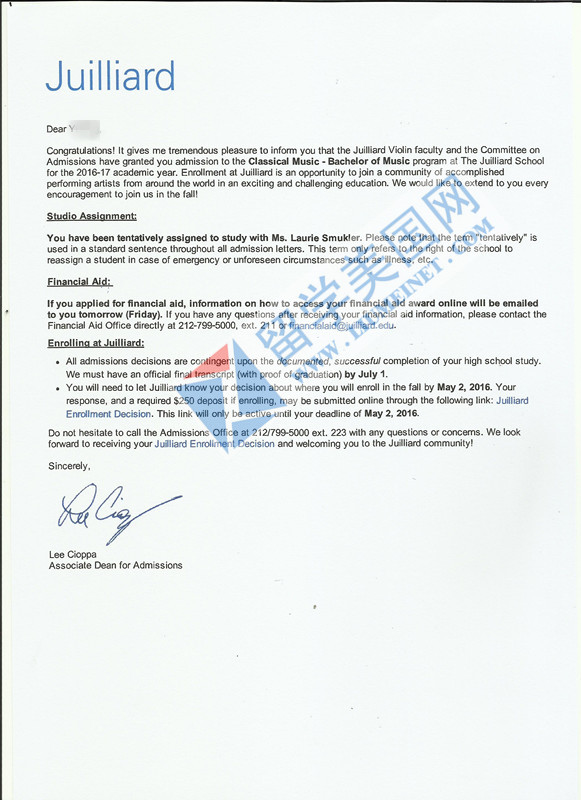 学生:张同学 在读学校:北京某中学 语言成绩:有 录取院校:茱莉亚 申请评估:张同学一个非常漂亮的女孩,小提琴拉的非常出色。众所周知,在每年的大学申 请中,音乐学院的截止日期较早。张同学找到我们已经是11月中旬了,音乐大学申请接近截 止。在这么短的时间内,托福成绩不够高,申请如此顶尖的音乐学院,要完成几所学校的个 人简历,ESSAY,作品上传及网申,这对我来说是一个十分艰巨的任务。 |