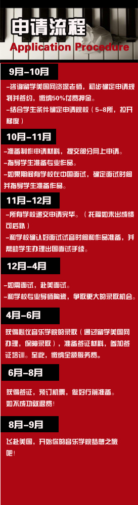 申请条件: IBT成绩,一般本科要求不高,很多知名的音乐学院提供ESL课程,例如比如曼哈顿音乐学院是需要本科79分,不过49分以上就可以申请。面试一般有三种形式,到校面试,地区面试和递交录音。参面试的话需要自带伴奏。