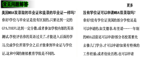 【什么是双录取】 所谓“双录取”是针对无语言成绩或语言成绩达不到入学要求的学生,学校发出两份录取通知书:一份是该校的语言中心录取通知书,另一份是该校的MBA有条件录取通知书。学生入学后,先进入语言中心学习英语,语言过关后,无需另行申请,可以直接进入大学学习。美国大学双录取项目既保证每一个符合条件的申请人都能获得学习的机会,同时又保证学校的正常教学不会因为学生听不懂课程而被延误。 【双录取的优势】 ★ 无语言要求 : 除部分商学院需要语言成绩,大部分双录取院校不要求语言成绩; ★ 择校灵活 : 可根据学生需求,学校排名、学习费用、地理位置等灵活选校; ★ 申请周期短 : 学校审核周期最快一个月获得Offer; ★ 奖学金丰富 : 最高申请金额可获得2万美金; ★ 签证有保障 : 双录取通知书大大提升了签证通过率。 【双录取招生对象】 ★ 大学本科在读、本科毕业生或在工作中有工作经验的各业人士; ★ 大学在读或大专毕业(包括电大,自考、HND等),可作为转学分就读美国本科。 【毕业动向】 ★ 向世界500强迈进,获得有发展前景的工作; ★ 回国进入沿海外企工作,语言和外国学习经历是不错的敲门砖,获得高薪,高起点的工作; ★ 向创业方向发展,进入二、三线城市,发现市场机遇,学以致用,获得创业经验。 |