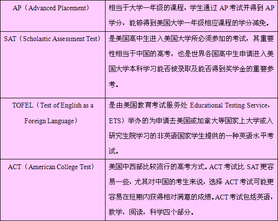 学生在完成必修及自选的课程外,可以按照自己的能力和兴趣选修大学预备课程,也就是AP课程,从而为进入美国一流高校打下坚实的基础。美国大学的入学考试是SAT和ACT,目前国内大多数学生不能够取得高分是由于中美教育的差异及英语水平欠佳,而在美国读高中的交换生就有了足够的优势。