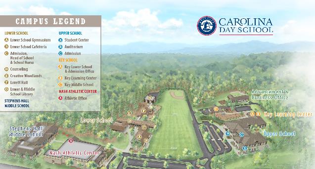 卡罗莱纳日校(Carolina Day School)坐落在蓝岭山脉的山脚下,这里既有适合学习的安全场所,又可以让学生充分利用阿什维尔这座中型城市的各种生活便利。校内的4栋教学楼分别对应高中、初中、小学服务,还有一栋是纳什体育馆。科学实验室最近进行了翻新,以适应学生21世纪的学习习惯。学校附近地区还有一个32英亩的综合运动场馆,有足球和曲棍球场地。学校的大钟是学校的象征,代表了丰富的历史和充满希望的未来。大钟安置在小学部的庭院内,在很多学校传统和活动中起到了重要作用。每年开学时,学生鸣钟召集全体师生集合,12年级学生则将敲钟看成是他们毕业典礼之前最后的仪式。