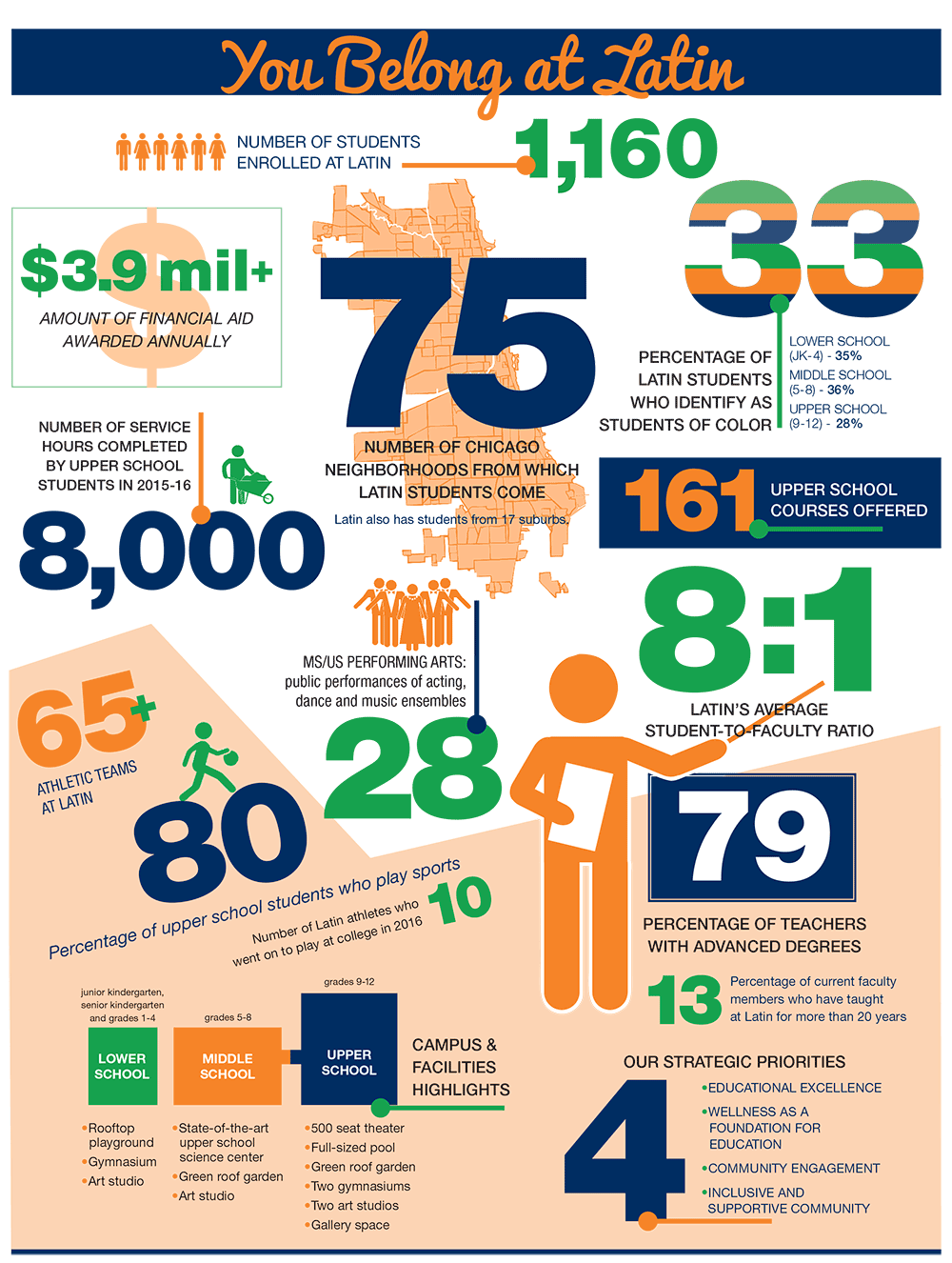 作为芝加哥地区第一所独立学校,芝加哥拉丁学校在其130年的历史中,始终保持着芝加哥中小学教育的领先地位,各种有关学校的报道在各大报刊上屡见不鲜。学校不仅满足于学生学习成绩的提高,还深入设立了艺术、历史、社会救助等一批综合性项目,旨在培养社会精英人才。学校拥有一流的校园,聘用了著名的设计师进行设计。例如,高中教学楼是由国际著名设计师哈里·韦斯建造的;其互动科学体验馆荣获2012年美国大学优秀设计奖。建校以来,学校一直保持着一流的学习水平。每年都有不少学生被哈佛大学、普林斯顿大学、耶鲁大学、西北大学、芝加哥大学等名校录取。毕业生校友广泛,有前美国第一夫人,联邦终身大法官,著名艺术家等等。