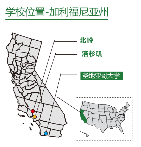 学校位于具有美国加利福尼亚州“天使之城”之称的洛杉矶市西北部,距离洛杉矶市中心仅有30分钟的车程,加州州立大学和加州大学洛杉矶分校就坐落于这所学校的周边。洛杉矶位于美国西岸加州的西南部,这里阳光明媚,气候温和。另外,该城市还是拥有巨大影响力的国际化大都市,全世界的文化、科学、技术、国际贸易和高等教育的中心之一,这里还拥有世界知名的各种专业与文化领域的机构。