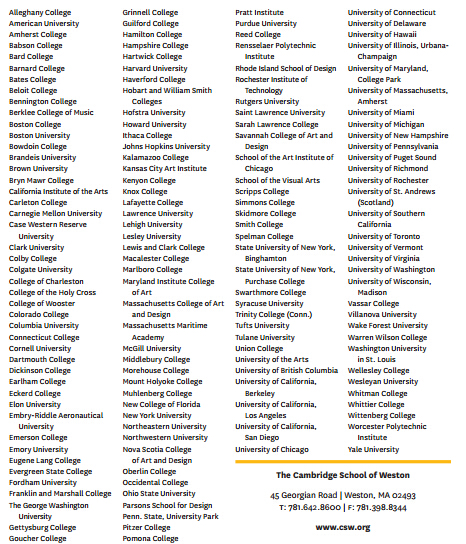 伯克利音乐学院2、波士顿学院4、波士顿大学15、布兰迪斯大学5、卡内基梅隆大学3、凯斯西储大学2、芝加哥哥伦比亚学院1、康奈尔大学8、柯蒂斯音乐学院1、德鲁大学3、杜克大学1、哈佛大学1、约翰霍普金斯大学2、茱莉亚学校1、劳伦斯大学1、马里兰艺术学院1、麻省艺术与设计学院4、麦克吉尔大学1、新英格兰音乐学院1、纽约大学5、东北大学6、西北大学3、普渡大学2、雪城大学8、杜兰大学5、加利福尼亚大学伯克利1、伊利诺伊大学厄本那香槟分校2、旧金山大学2、南加州大学1、圣安德鲁斯大学1、多伦多大学1、佛蒙特大学16、弗吉尼亚大学3、威斯康星大学麦迪逊分校2、范德堡大学1、瓦萨学院6、韦尔斯利学院3、威廉姆斯学院1、伍斯特理工学院5、耶鲁大学1