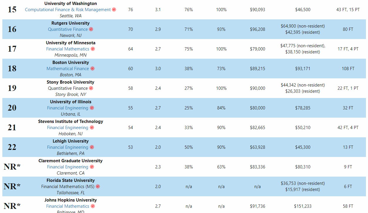 金融工程专业权威排名网站QuantNet,在2022最新北美金融工程硕士项目排名中,对36个Financial Engineering、Mathematical Finance、Quantitative Finance硕士项目的招生、就业和职业服务信息进行调查,信息不完整的项目不参与排名(显示为NR)。